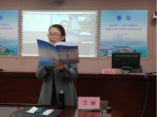下午4:30,袁丽老师代表专家组宣读了本次论坛的评审结果,共收到西南大学、浙江师范大学、广州大学、湖南师范大学、湖南科技大学、湖南工业大学、湖南理工学院等10余所高校在读教育硕士专业研究生的自制教具和论文130余件(篇),经专家组精心评选,共评出优秀自制教具一、二、三等奖30项,优秀论文一、二、三等奖30项。教科院院长刘理教授、研究生院副院长黎振强教授向获奖研究生颁发了荣誉证书。