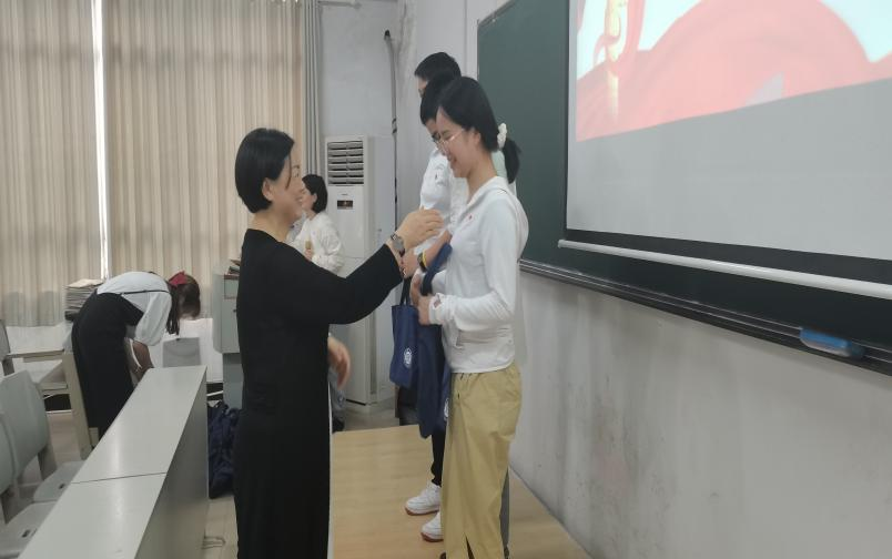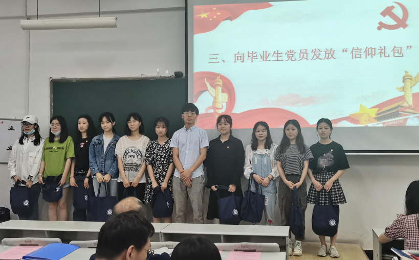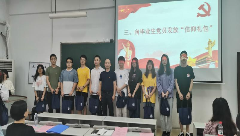 党课结束后,党委书记周畅、副书记张陈武、学生第二党支部书记严胡伟向毕业生党员发放“信仰”礼包。周畅深情地对同学们说道:“希望毕业生党员能够继续‘不忘初心,牢记使命’,以党章为本,同信仰为伴,继续积极学习和弘扬党的先进思想理论,展现出一个良好的大学生党员的精神风貌”。