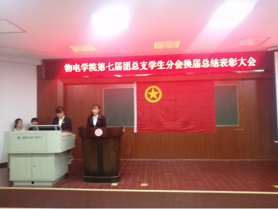 大会共分为十二项议程,在嘹亮的国歌声中,总结表彰大会正式开始。首先由张恒道老师致辞。议程第三项是团学各部门进行了任期内的工作汇报,部门用一张张照片,一份份表格,一个个数据清楚的展示自己在一年里所做的工作议程第四项是第七届团学分会主席林琪琅和学生副书记刘妍做团学工作总结报告。议程第五项团总支书记张恒道老师宣读了表彰文件并对优秀干部干事进行了颁奖。议程第七项宣布第八届团学委员名单。议程第八项第八届学生会主席李泽鹏,学生副书记黄欢进行了就职发言,议程第九项两届主席团交接院旗。议程第十项第八届团学委员会委员进行了集体入职宣誓。