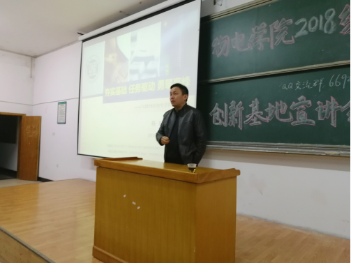 李宏民院长首先就创新基地做了简单的介绍。随后,陈松老师进行创新基地宣讲。陈松老师的报告围绕“学什么?”“怎么学?”“学到什么程度?”三个问题展开。陈老师将创新基地同学的参考教材、学习方法和评价标准展示给大家;将自身的教学经历与学生实例告诉大家;并告知大家要善于打破传统,勇于创新,将自己的想法付诸于实践。陈老师的报告严谨而幽默,报告会气氛热烈。最后,陈老师耐心为大家的问题进行了解答。