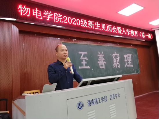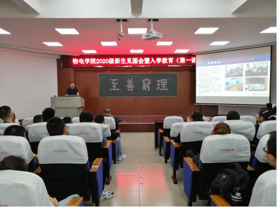 会议伊始,院长李宏民从学院所设专业、师资力量、科学研究等方面介绍了学院概况,并就学院近年考研相关数据、科学育才成效向新生作出汇报。还针对同学们最为关心的本学院各专业学生毕业形势作重要分析,指出物理学(师范)专业有国家政策支持,电子和微电子专业人才目前在国内还比较紧缺,只要同学们认真学好本专业知识,我院的就业前景不容小视。与此同时,院长还表达了对同学们的殷切期望与热情关怀。
