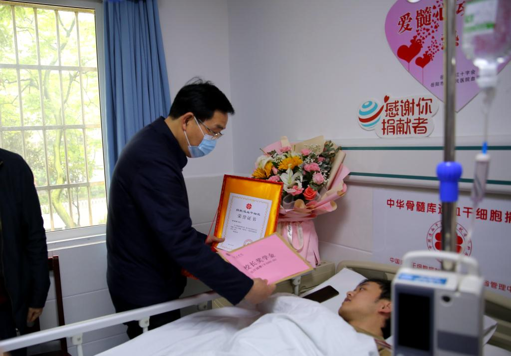 当天,校长宁立伟和sunbet申搏、学工部负责人来到岳阳市一医院看望慰问杨旭琪,宁立伟为杨旭琪授予了“捐献造血干细胞”荣誉证书,并颁发了“校长奖学金”。