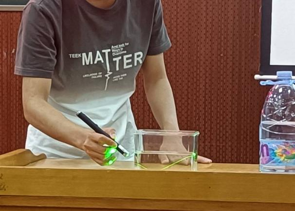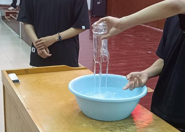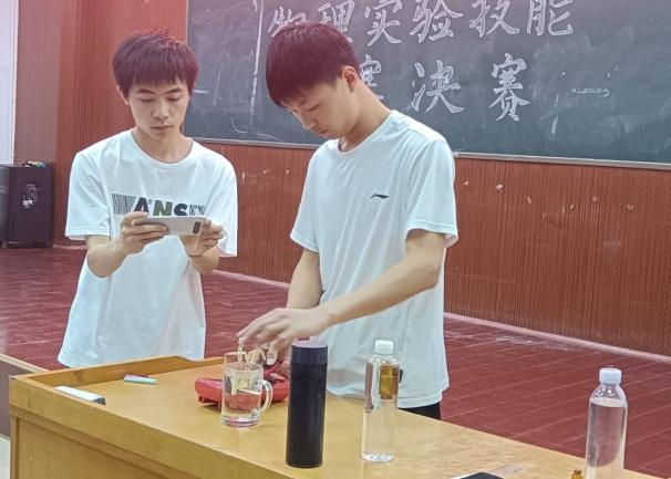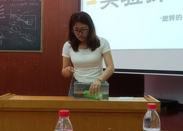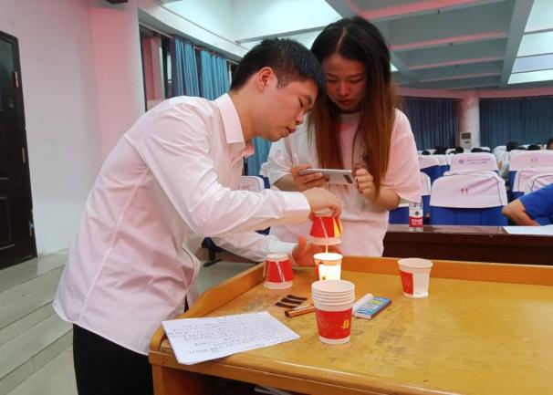 决赛共有9个团队,均为前期工作选拔出来的优秀选手,比赛要求参赛者进行实验展示、现场投屏和实验解说。实验展示中,他们严谨细致、合作默契、实验效果明显、成功率高,展示了良好的团队合作精神;现场投屏环节,各组利用现代教育技术将实验过程同步放大到屏幕的创新做法,让全场观赛者十分清楚观察到实验细节;实验解说环节,他们科学有序、条理清晰、重点突出、简洁易懂,可以从有趣的实验现象中很好地把握其中的物理规律。参赛者选取纸张、蜡烛、玻璃、食用油、水等生活日用品作为比赛实验器材,展示神奇的物理现象,深深感染了在场观众,同学们沉浸在科学探究之中。
