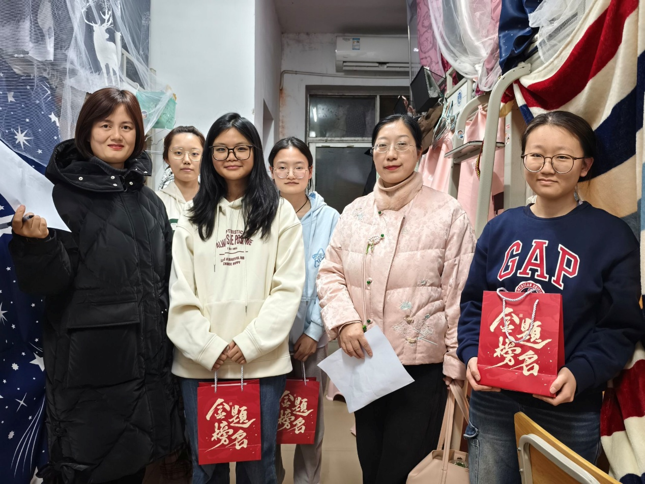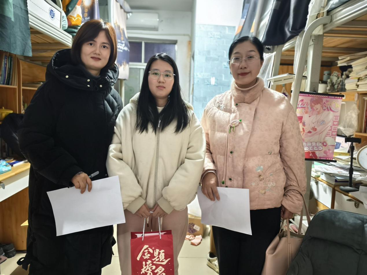 12月18日晚,物电学院党委书记周畅、副书记石红芳、副院长邹志军及辅导员何小娅、李哲君、姚世鹏带领学生干部前往毕业班寝室开展考研慰问活动
