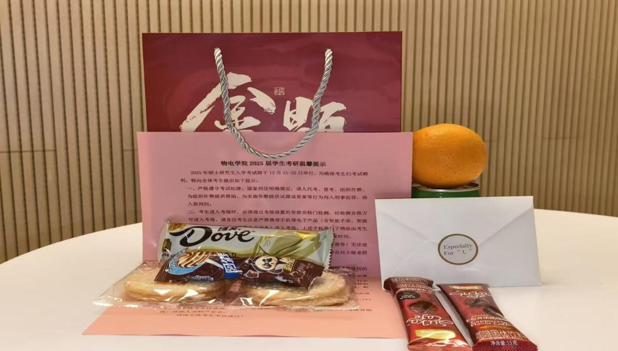 学院为考研学子精心准备了“金榜题名”考研加油包有心想事“橙”,有运气旺旺的“旺仔牛奶”,有手写的祝福语等。一件件贴心的礼物,一句句鼓励的话语,满载着学院对考研学子的深切关怀和殷切希望。