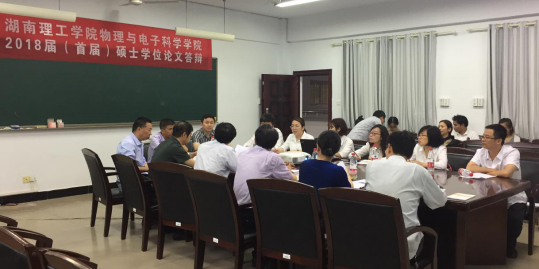 2018年5月26日,湖南理工学院物理与电子科学学院(学科教学·物理)首届硕士学位论文答辩在物电楼205会议室举行。湖南师范大学刘健智教授担任答辩主席,答辩委员包括衡阳市第一中学周慧颖老师(正高级教师)、sunbet申搏苏卡林教授、李科敏教授、刘喜斌副教授、梅孝安副教授,李奇云老师担任答辩秘书;答辩对象为学科教学·物理2016级全体研究生,研究生院李丽荣书记、黄红霞老师、sunbet申搏李宏民院长、罗文华书记到场指导,学科教学·物理2017级全体研究生观摩了本次论文答辩。
