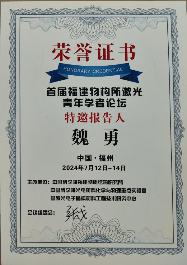 魏勇教授特邀报告荣誉证书
