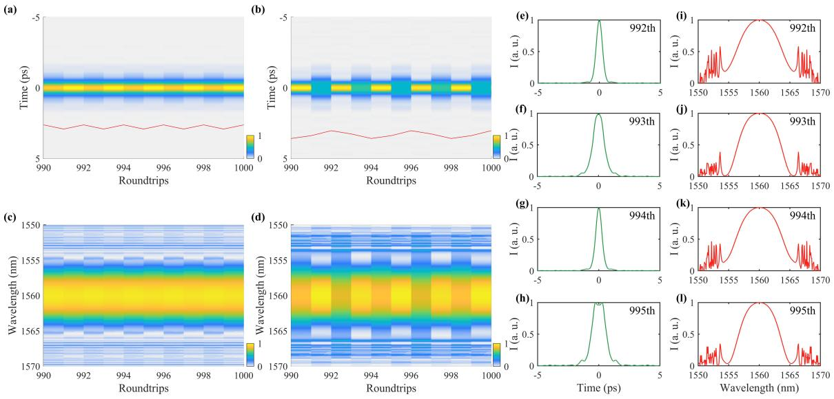 该研究以数值方式展示了在具有纯高偶数阶色散的孤子光纤激光器中产生脉动动力学,如图3所示。研究结果主要揭示了两种类型的脉动,爬行状态和周期分岔,它们主要是由自相位调制和高阶色散诱导的相位之间的不匹配造成的。此外,通过观察由增加增益饱和能量产生的“分叉树”模式,我们揭示了纯高偶数阶色散孤子激光器中的独特模式,其特征是单个孤子状态(包括稳定锁模和脉动状态)和混沌状态之间的交替过渡。最终,通过分析不同纯高偶数阶色散和增益饱和能量下的状态分布,发现在高阶色散条件下更容易发生周期分叉现象。这些见解拓宽了对纯高次孤子的基本理解,并突出了新型激光系统中孤子脉动的普遍行为。/文 罗民、李昶