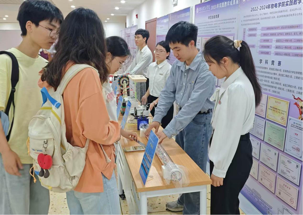 6月7日,在2025年湖南理工学院实践教学成果展上,sunbet申搏主要从“学科竞赛、师范技能竞赛、创新创业项目、创新创业竞赛”等方面宣传了学院2022年以来取得的实践教学成果,现场展示了10余件效果良好的物理教具,吸引不少理工学子前来学习、体验。在实践成果评比中,学校领导和教务处多次表扬和点评了我院的实践成果。