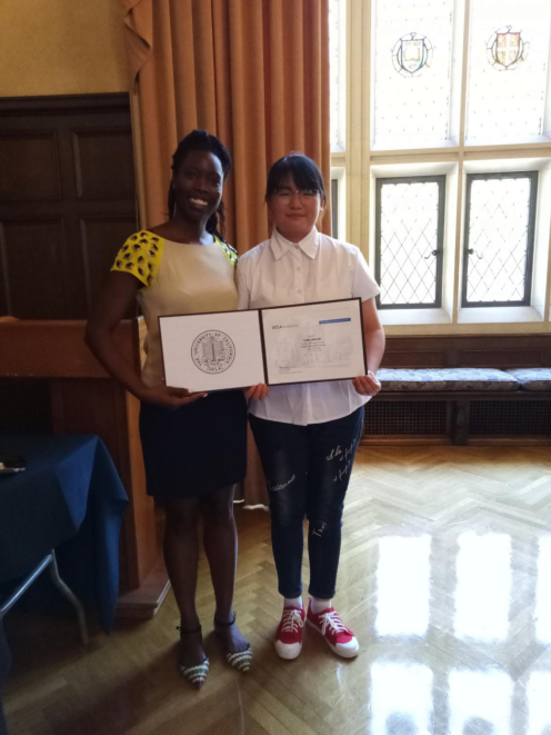 (在UCLA的大礼堂进行毕业典礼,国际交流学院的院长授予证书)